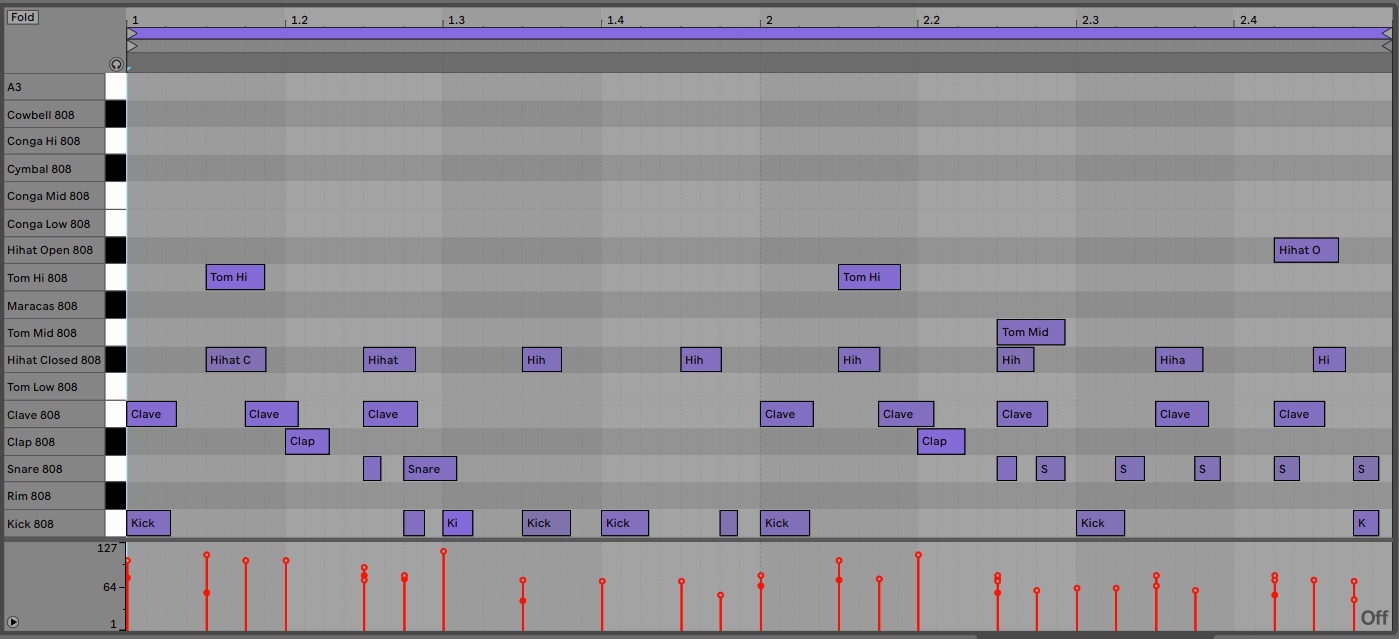 We created this 2 bars beat using Ableton Live 10. For the sounds we picked the 808 Core Kit.adg from the Drums folder.
